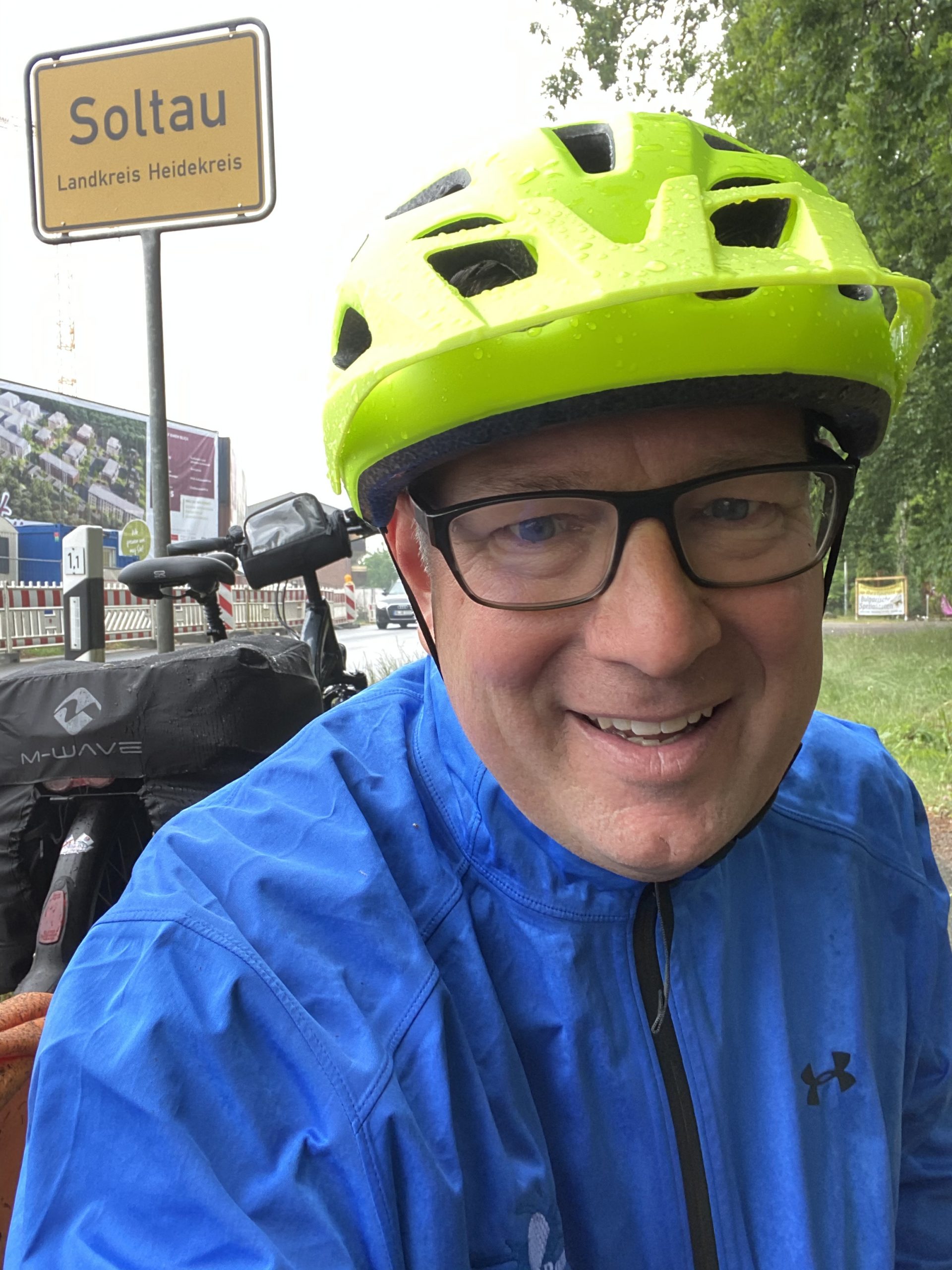 Nach weiteren 10 Kilometern setzte kurz vor Buchholz in der Nordheide kräftiger Dauerregen ein. Das hatte mir gerade noch gefehlt, aber ich wusste ja, dass das kommen würde. Man(n) hat ja eine Wetter-App. Leider war ich nicht so schnell in meinen Regenklamotten wie gedacht. Ich war bis auf die Haut und dem letzten Zeh ziemlich durchnässt. Kurz vor Soltau ließ der Regen wieder nach. Ganz getrocknet bin ich auf dem Weg zum Hotel aber nicht mehr.