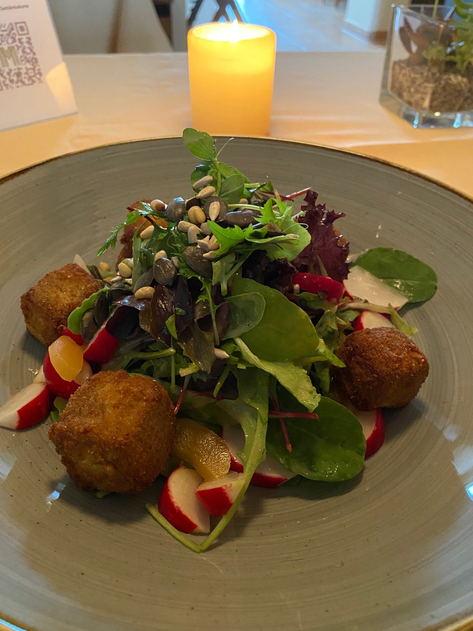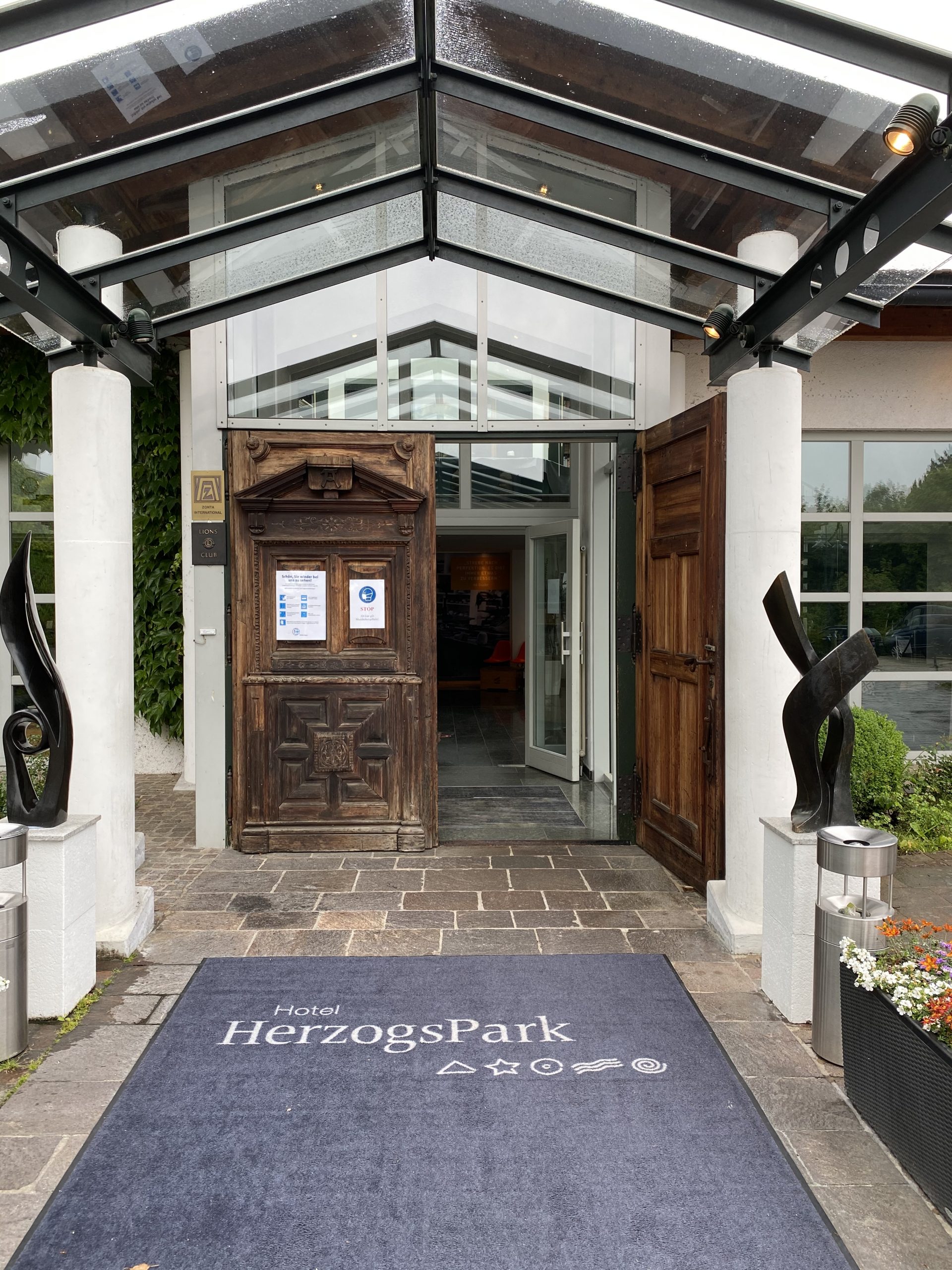 Im Hotel HerzogsPark wurde ich sofort mit „Hallo Herr Beyer“ begrüßt. „Sie sind doch der Golfer“, lautete es weiter. Dies konnte ich ja nur bestätigen und fühlte mich sofort herzlich willkommen. Ich durfte sogar meinen verschmutzten Anhänger und mein Fahrrad durch die Hotellobby in einen extra Raum schieben, um dies sicher zu verstauen. Was für ein toller Service, das fand ich richtig klasse. Ich bekam dann noch meine Zimmerkarte und als ich mit dem Fahrstuhl nach oben fuhr und mein Zimmer öffnete, war ich total beeindruckt. Ich hatte wirklich ein tolles Zimmer erwischt, riesengroß, super gepflegt, für mich war das schon eine Suite. Ich habe mich kaum getraut, meine schmutzigen und nassen Klamotten abzulegen. Aber nützt ja nichts, das musste sein, sonst trocknete ich nicht. Ich hüpfte noch schnell unter die Dusche und mache mich frisch auf ins „Stüberl“, dem Hotelrestaurant. Dort gab es als Vorspeise für mich leckere Blattsalate und als Hauptspeise genoss ich Ragout vom Wild. Mann war das lecker.