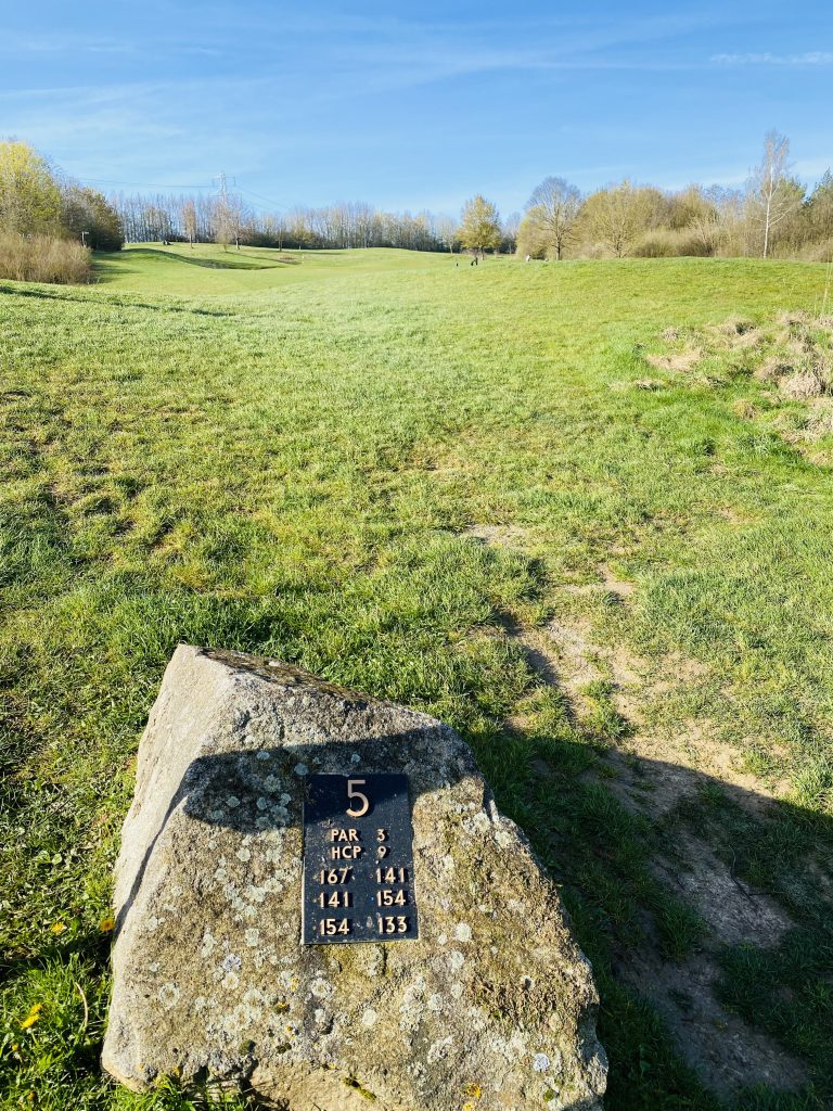 Beinahe hätten wir die Bahn 2 ausgelassen und direkt von der Bahn 7 abgeschlagen. Entweder waren wir noch nicht ganz wach oder aber die Beschilderung zur zweiten Bahn ist missverständlich. Jedenfalls wollten wir sehr zielgerichtet auf die nächste Bahn, bis Marcus kurz vor dem Aufteen bemerkte, dass wir uns an der falschen Bahn befinden. Ok, kurzer Blick auf den Gesamtplan und die Bahn 7 links liegen lassen, bevor es leicht nach rechts zum zweiten Abschlag geht. Ab jetzt waren wir stets auf der richtigen Spur. Vom Abschlag hatten wir eine wunderbare Rundumsicht ins leicht hügelige Umland. Mein Abschlag war mäßig und ging leicht links ins Semi-Rough. Marcus Ball landete rechts im Semi-Rough. Mit viel Glück schlug ich meinen zweiten Ball völlig missraten durchs Gehölz. Aber der Ball rollte tatsächlich irgendwie in Richtung Grün und blieb ca. 2m davor liegen. Erstmals konnte ich zumindest, was die Anzahl der Schläge angeht, mit Marcus gleichziehen.