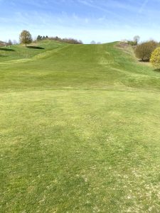 Als wir die Bahn verließen, freuten wir uns auf ein entspanntes Par 3-Loch. Den Abschlag bzw. den Bahnverlauf konnten wir noch nicht sehen. Wir mussten auf einen kleinen Hügel und sahen von dort, dass es sich um ein landschaftlich sehr abwechslungsreiches Par 3 handelte. Nach dem Abschlag auf dem Hügel geht es tiefer in eine Senke, um dann doch recht steil bergauf laufen zu müssen. Mit dem Trolley kam ich ganz schön ins Pusten. Aber eine tolle und Bahn, wie ich finde. Wir kamen mit unseren Abschlägen sehr gut ans Grün (Marcus natürlich aufs Grün). Vor allem das zweite Bild unten zeigt die hügelige Landschaft sehr deutlich.