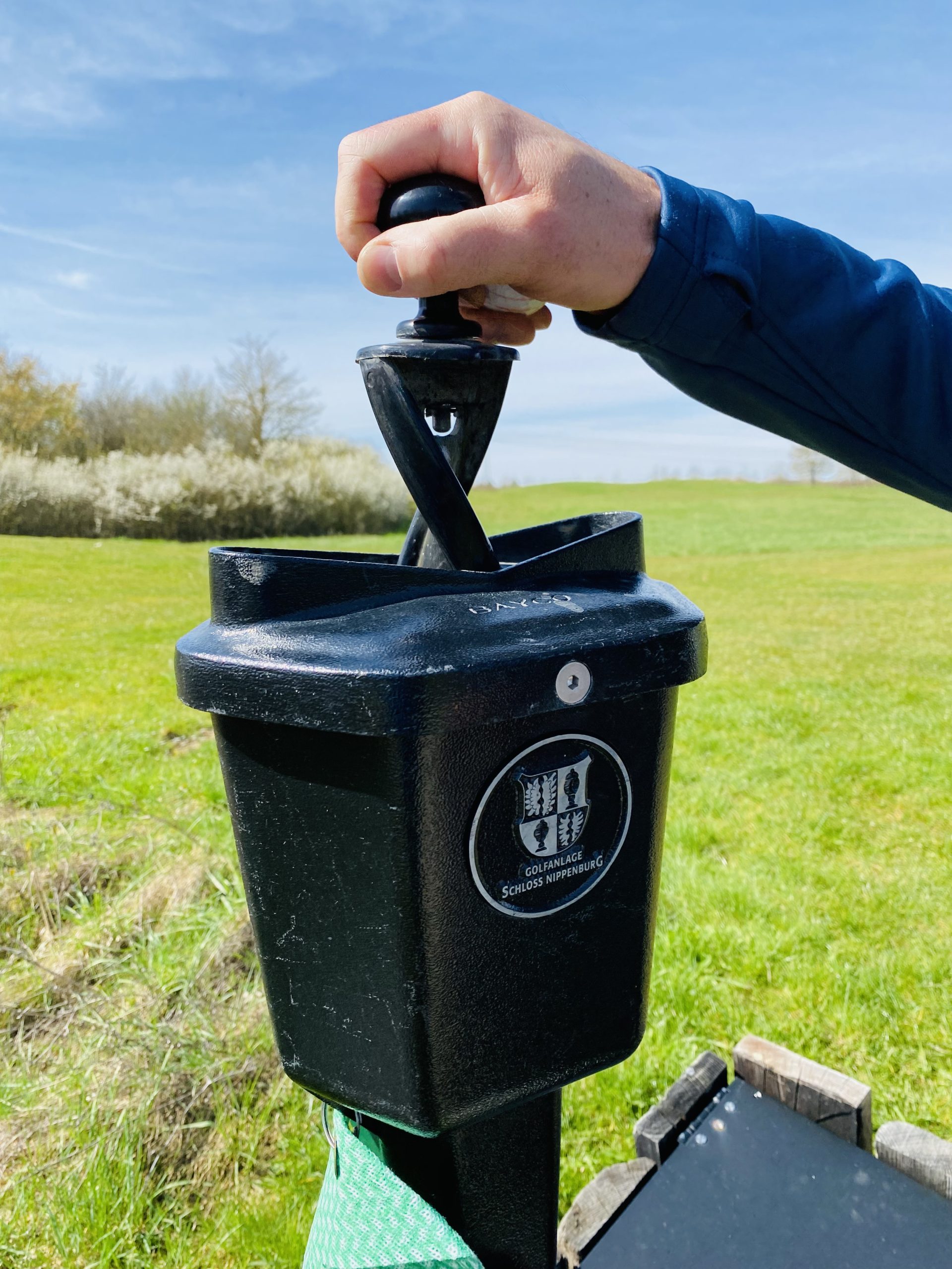 Die Bahn 9 führt sehr eben zurück zum Clubhaus. Den Presseturm sieht man schon von weitem. Das breite Fairway am Anfang wird im Verlauf etwas enger. Eigentlich ist die Bahn nicht kompliziert zu spielen, wenn man sich etwas konzentriert. Ich war wohl etwas zu risikofreudig. Zwei Bälle landeten nach dem Abschlag vom Fairway links im See. Immerhin habe ich einen mit der Ballangel retten können 🙂