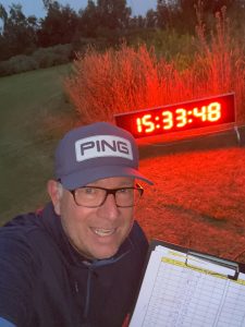 Ich war um 22:24 Uhr und somit nach “nur” 8:24 Stunden am Ziel. Der neue, offizielle Weltrekord war aufgestellt. Ich fühlte mich noch total locker und entspannt. Ab jetzt hieß es nur noch verletzungsfrei durchkommen, genießen und noch einige Bahnen drauflegen. Besonders gefreut habe ich mich, dass mich mein Trainer und Golf-Pro Douglas Appleton um 4 Uhr morgens!!! für zwei Stunden auf meinen Runden begleitete und für jedes seiner gespielten Birdies 5,- Euro zusätzlich in die Spendenkasse spendierte. Ok, es wurden “nur” 12 Birdies, aber für die Uhrzeit nicht schlecht. Leider hatte es gegen 7 Uhr morgens angefangen zu regnen.