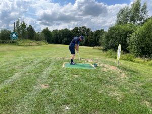 Pünktlich um 13:45 Uhr waren alle da, die mir wichtig sind. Meine Eltern sind extra aus Itzehoe gekommen, haben aber nicht auf Anhieb die richtige Zufahrt zum Golfplatz gefunden und somit fast den Anpfiff verpasst. Die schreibende. lokale Presse wollte noch ein kurzes Interview von mir und irgendwie musste Claudia, die Verantwortliche vom Golfpark Weidenhof, an den Start erinnern. Ich nahm lediglich meine zwei Schläger (PW und Putter) zur Hand und ging mit meinem ersten Begleitungsteam für die ersten beiden Stunden (Dieter und Axel) an den ersten Abschlag. Ich hatte gerade noch Zeit, mir meinen Handschuh anzuziehen und ein Mal tief durchzuatmen, da ertönte auch schon das Horn zum Start meines zweiten Weltrekordversuchs.